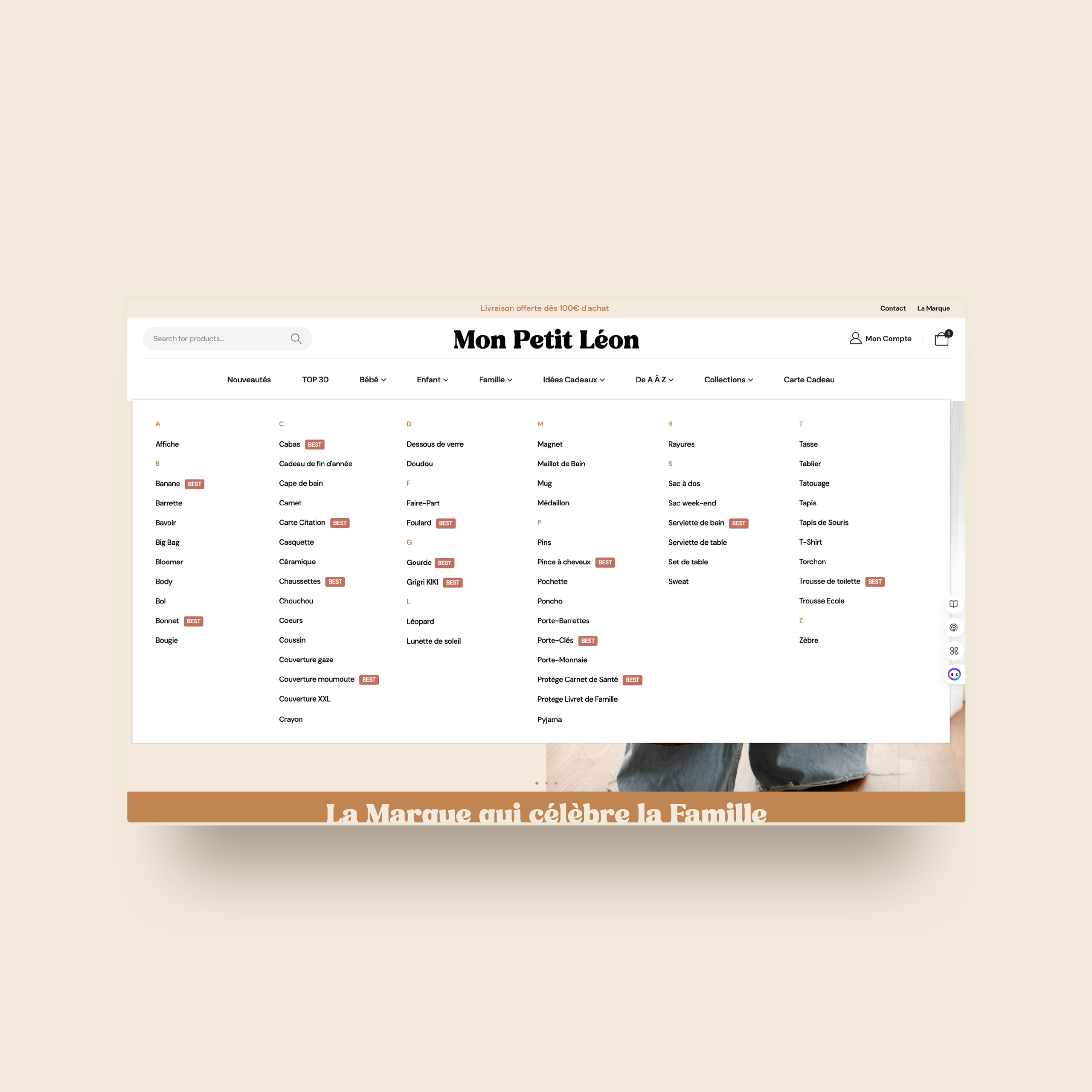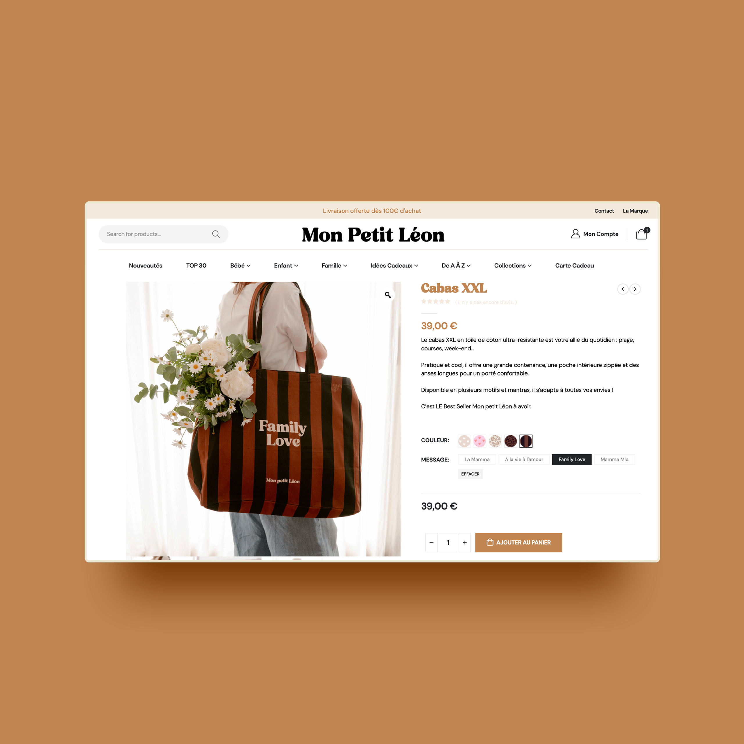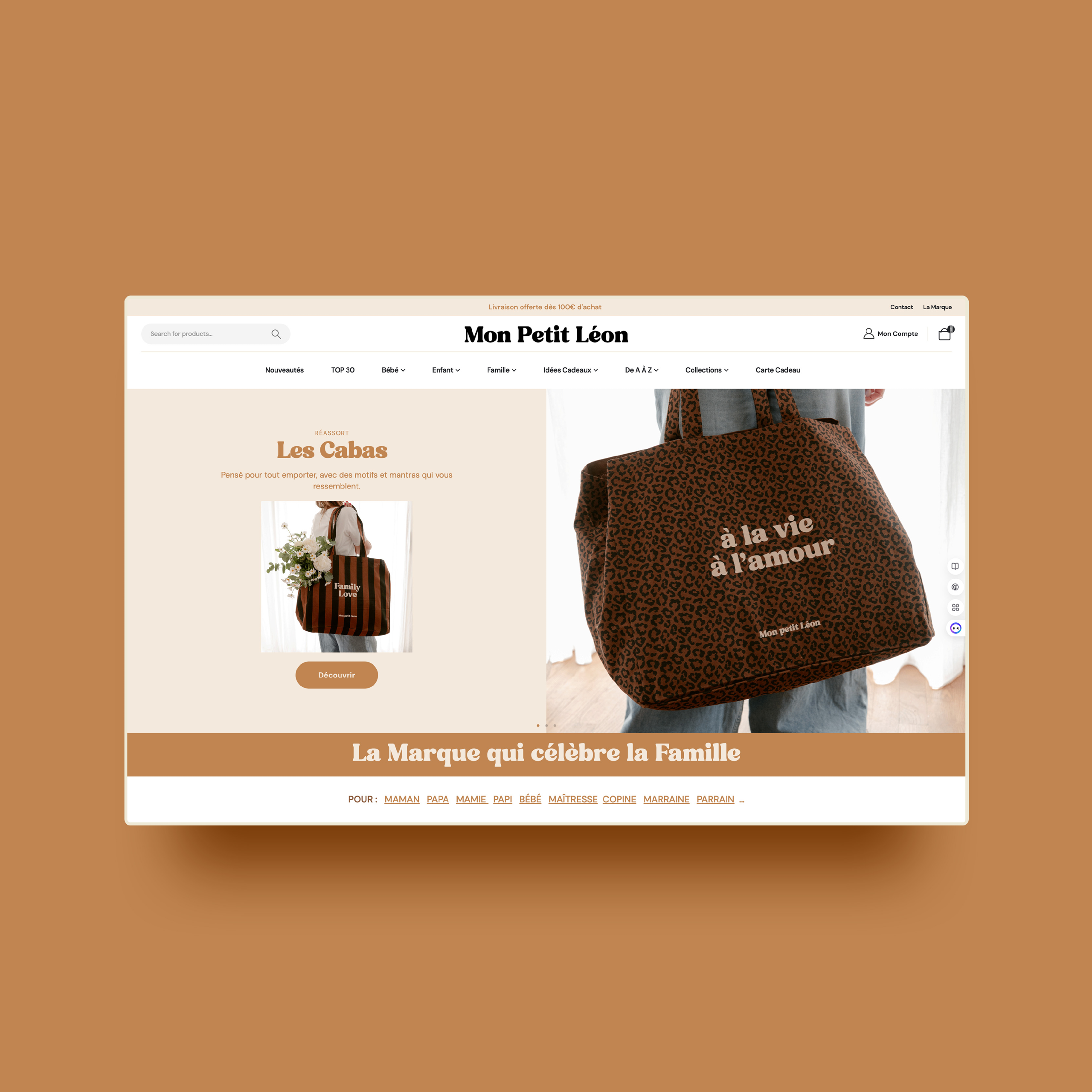 Refonte de l’identité globale Mon Petit Léon, marque d’accessoires personnalisés pour les familles. Nouveau logotype, univers visuel et illustrations. Conception du site e-commerce sur mesure avec module avancé de personnalisation des produits (typographies, couleurs, motifs).